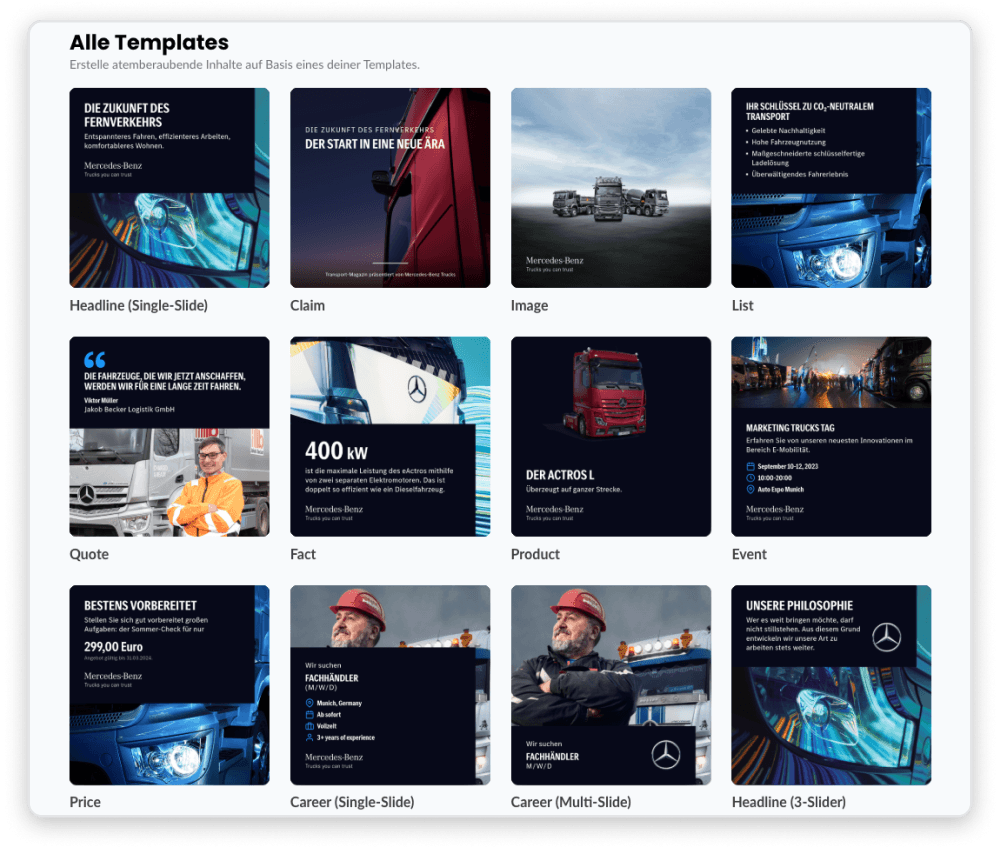 Du arbeitest immer auf Basis deiner individuellen Templatebibliothek. Alle Templates sind abgestimmt auf deine Corporate Identity und auf deine Ziele auf Social Media.