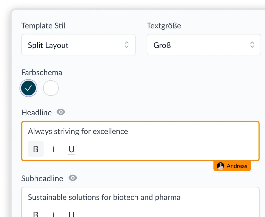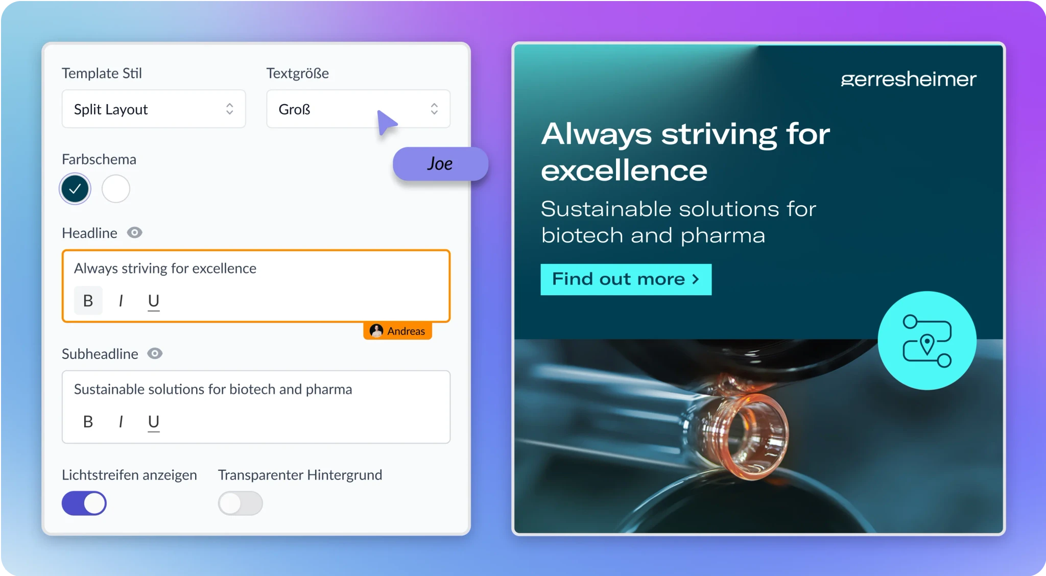 “Schnell und einfach zu handhaben und vielfältiger Output. Ich kann spontane Ideen schnell umsetzen, abstimmen und freigeben lassen und direkt runterladen. Auch Kolleg:innen oder Vertretungen, die nicht mit dem Tool vertraut sind, sind schnell an Bord und können das Tool nutzen. Es spart mir unglaublich viel Zeit.”