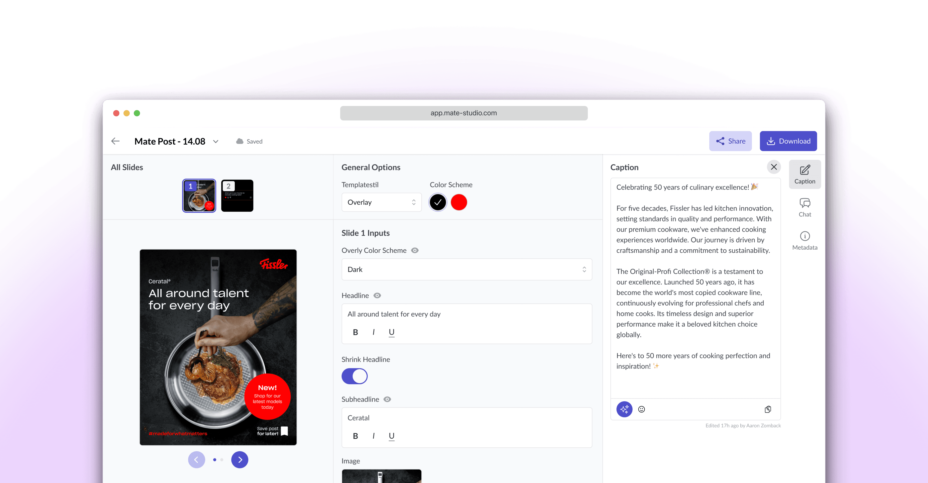 In weniger als 60 Sekunden und komplett ohne Designaufwand erstellst du mit Mate hochwertige Grafiken, Videos und Animationen für deine B2B Social Media-Kommunikation. Einfacher & schneller als je zuvor.